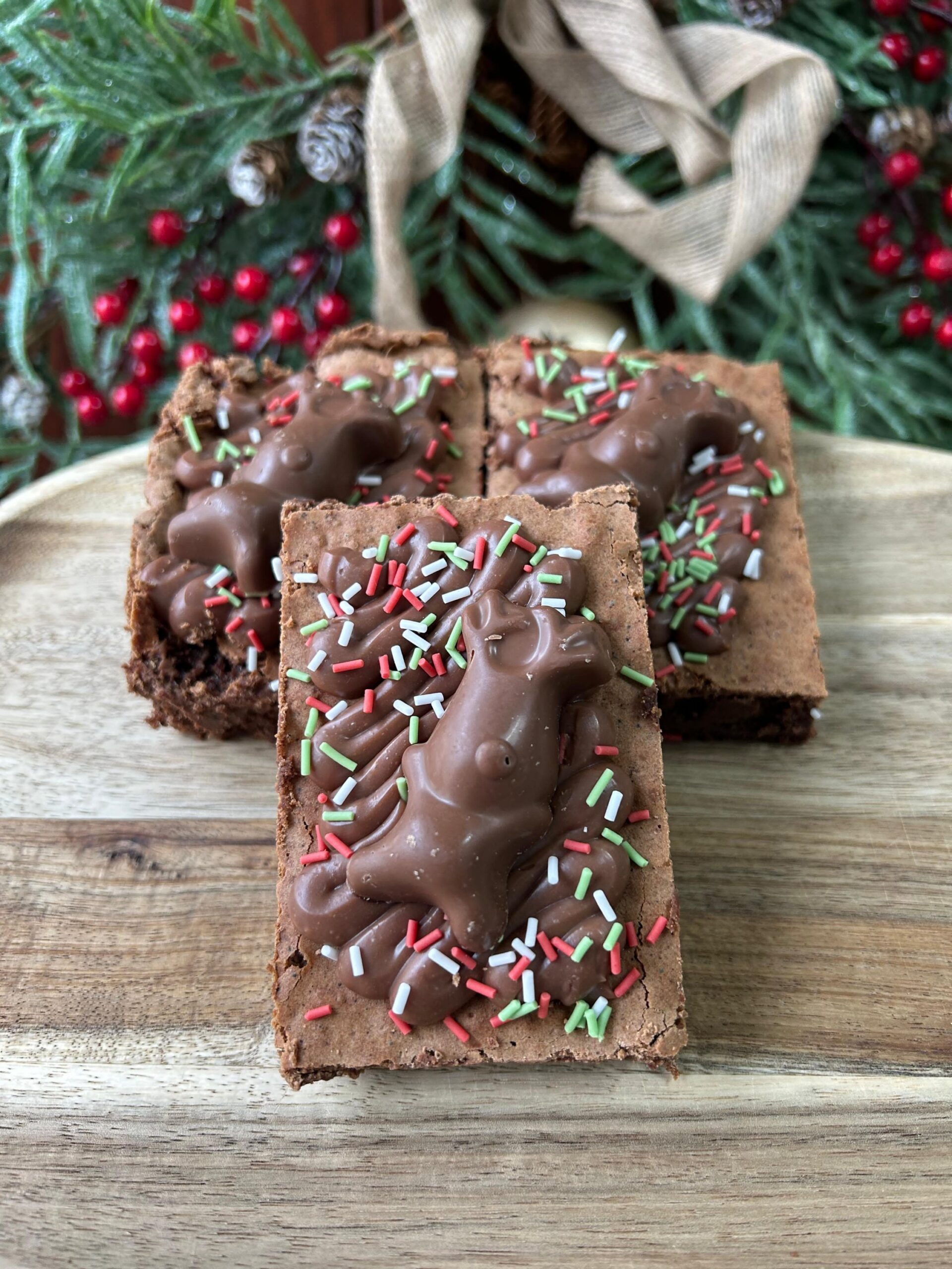 Delectable chocolate brownie with lashings of chocolate ganache, Christmas sprinkles and Malteser Reindeer
