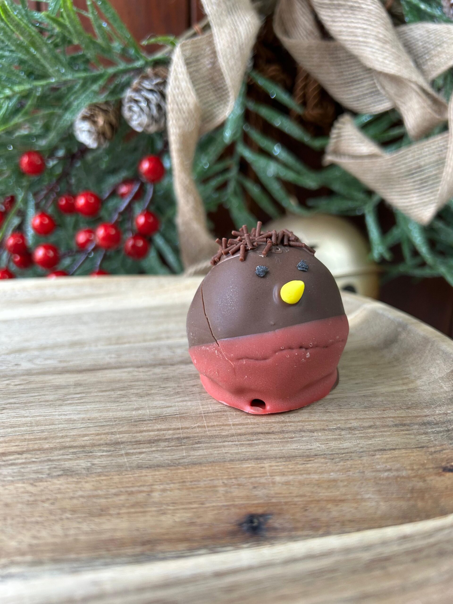 A delightful Christmas robin truffle filled with Oreo biscuit truffle, dipped in chocolate and decorated like a cheeky robin