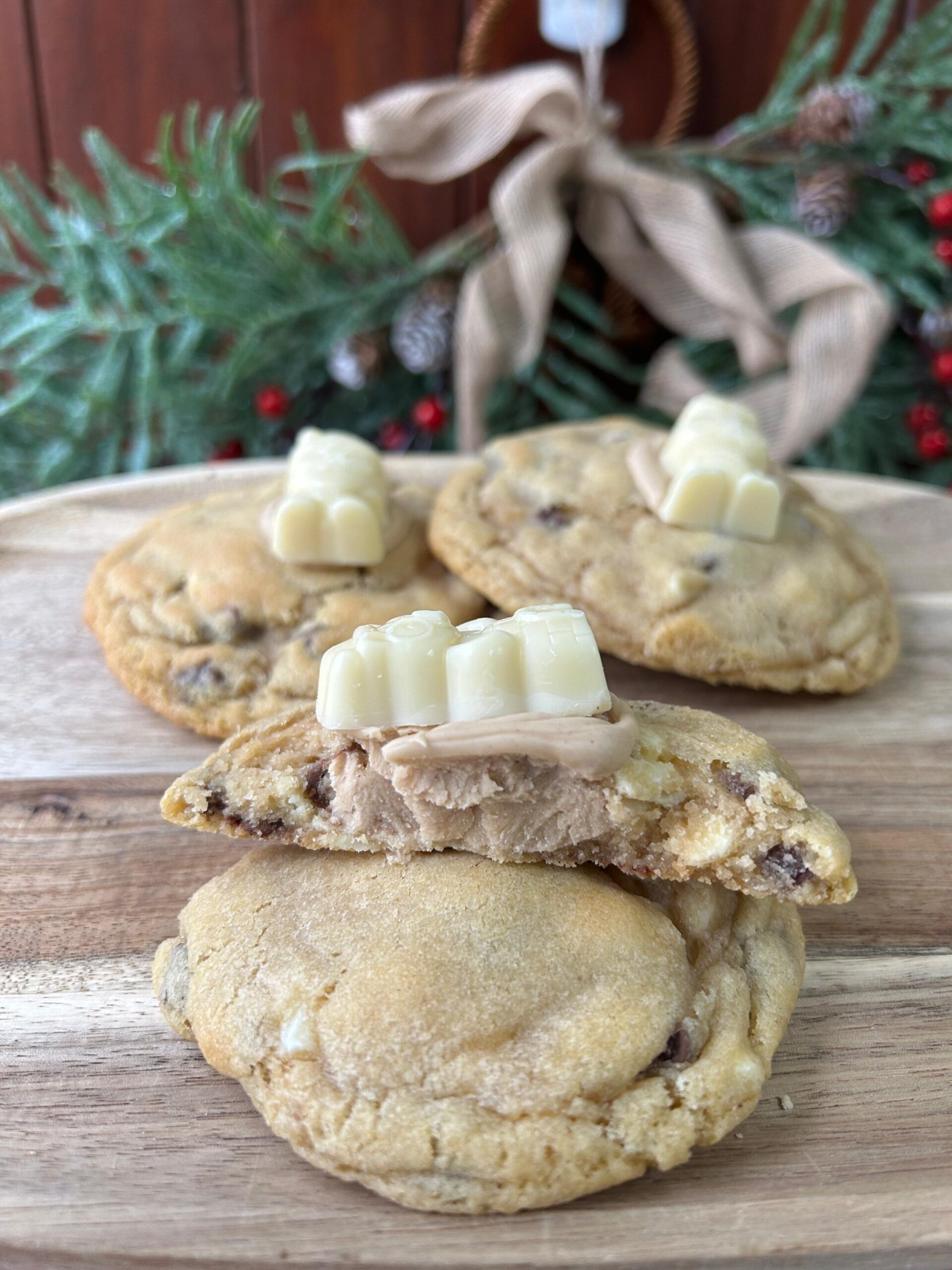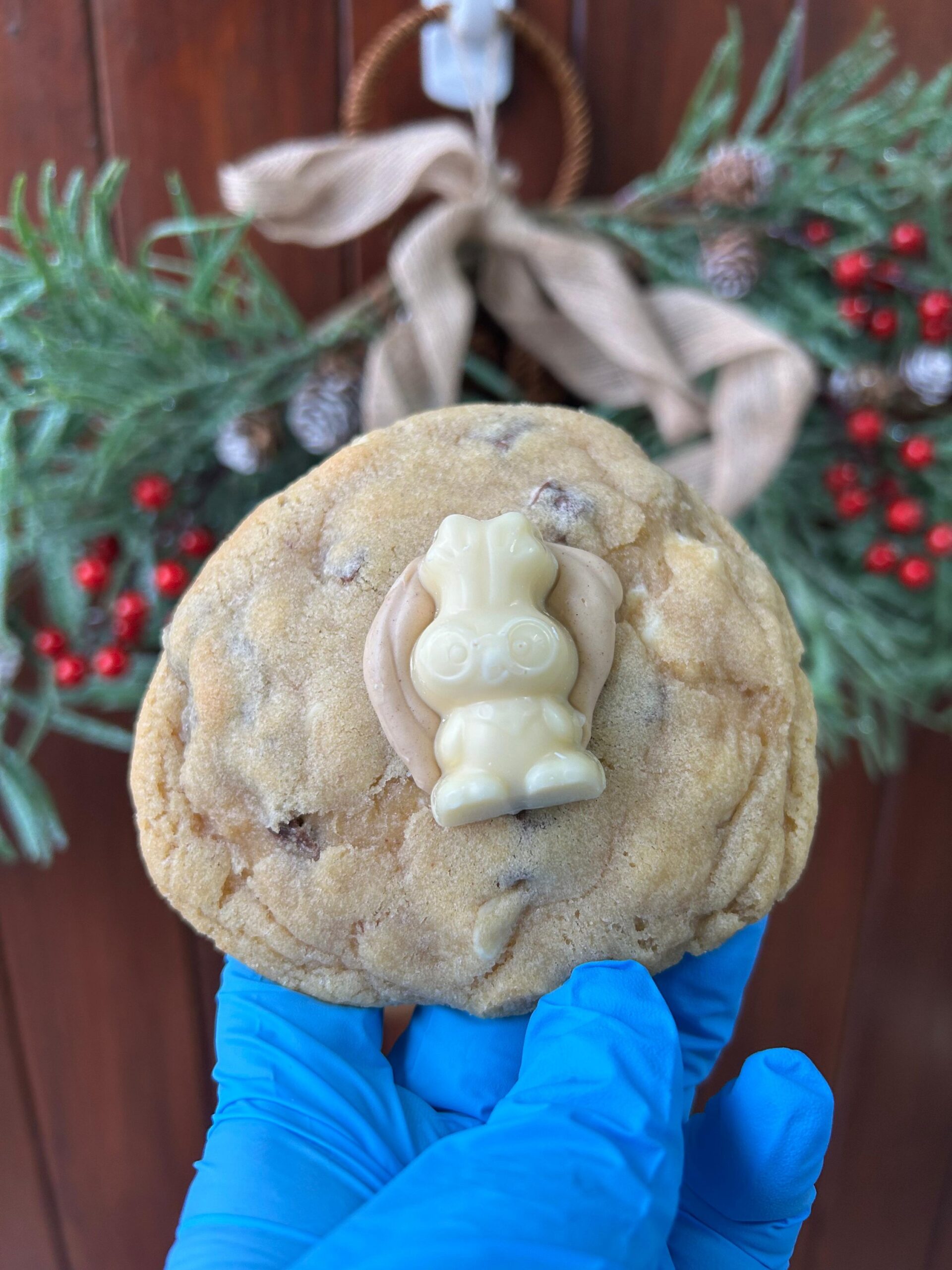 Our awesome chocolate chip cookie stuffed with Bueno sauce and topped with a Milkybar Festive Friend